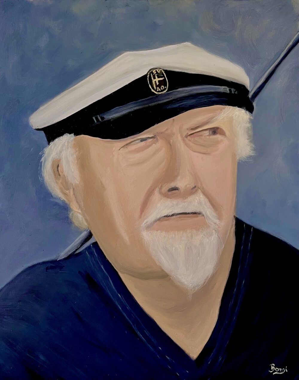 Kritischer Blick in die Ferne, oder aufs Wetter. "Der Alte Seemann" 80 x 100 cm, Öl auf Keilrahmen. Er bleibt bis zur großen Ausstellung "Hamburg, Hafen & Begegnungen" in der Grundbuchhalle des Justizgebäudes in Hamburg im Bestand. Die Ausstellung läuft vom 04.02. bis zum 09.04.2026.